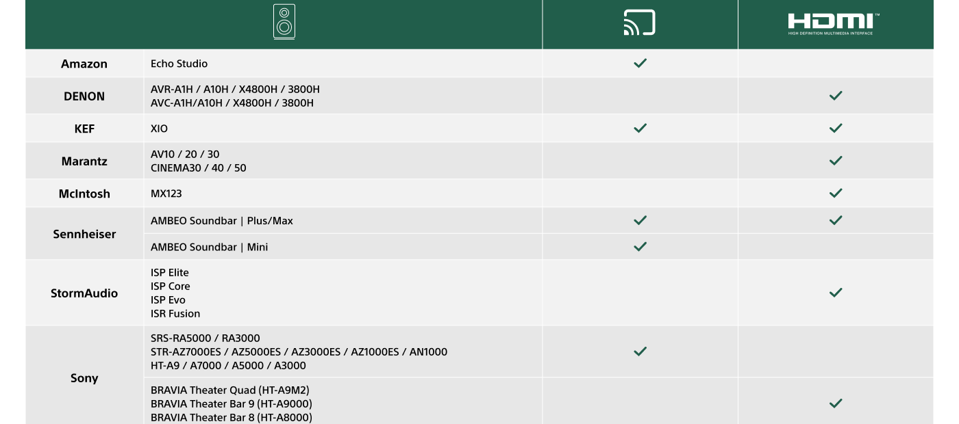 Les haut-parleurs certifiés 360 Reality Audio comprennent des barres de son et des récepteurs AV de marques telles que DENON, KEF, Marantz, McIntosh, Sennheiser et StormAudio.